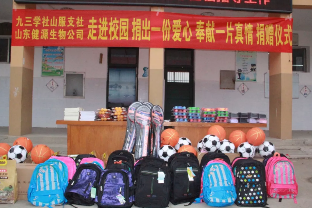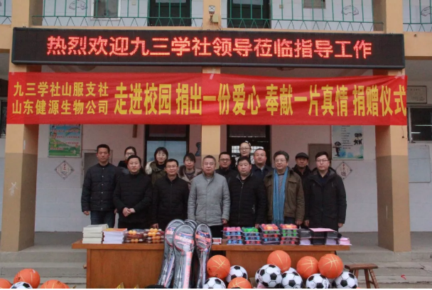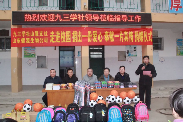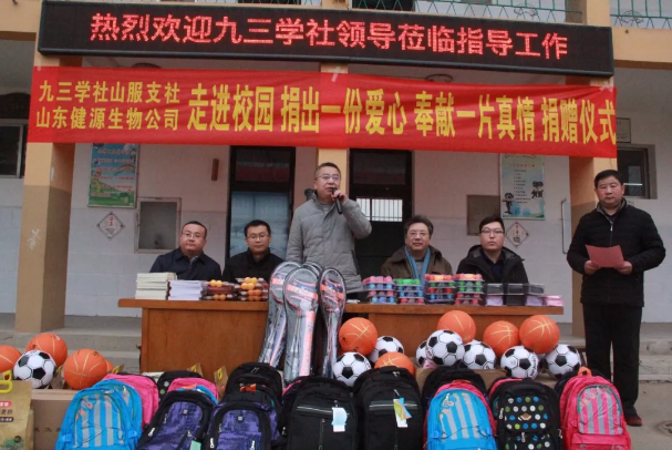 人生之善莫過于助人,助人之德莫過于助學(xué),為積極履行社會(huì)責(zé)任,關(guān)注支持貧困地區(qū)教育事業(yè)發(fā)展,2019年1月11日,九三學(xué)社與山東健源生物科技有限公司共同為泰安市高新區(qū)化馬灣鄉(xiāng)當(dāng)?shù)匾患倚W(xué)捐贈(zèng)了一批體育器材、學(xué)習(xí)用品及辦公用品,為該校師生送去了社會(huì)的關(guān)心和溫暖。