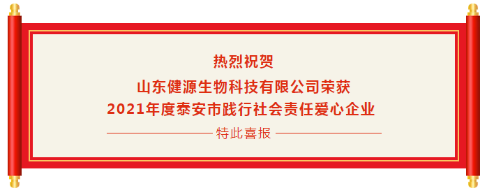 熱烈祝賀山東健源生物科技有限公司榮獲2021年度泰安市踐行社會責任愛心企業