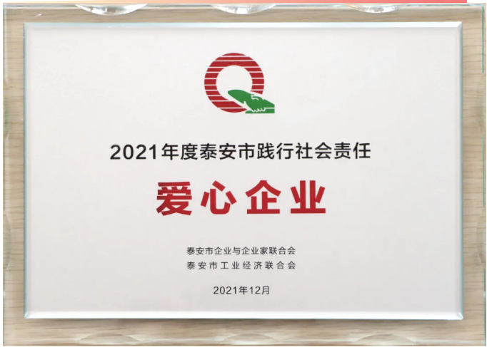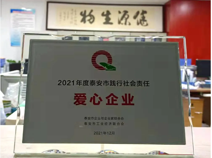 2021年12月26日,由泰安市企業與企業家聯合會和泰安市工業經濟聯合會主辦的2021迎新年銀企聯誼會在泰安萬達嘉華酒店隆重召開。大會對本年度涌現出的愛心企業、企業文化成果和先進個人予以通報表彰。