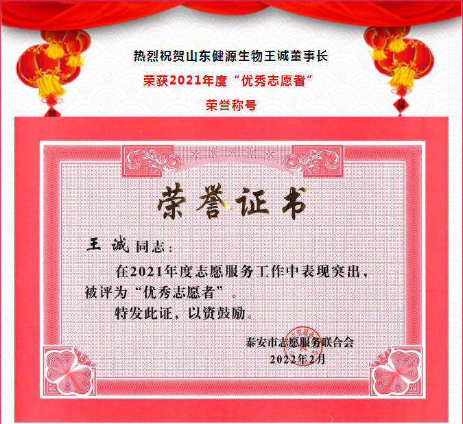 在2021年度志愿服務活動中,山東健源生物科技有限公司王誠董事長組織并參與社會公益、敬老助殘、科技扶貧等志愿服務活動,表現出“成人達己,成己為人”的高尚品質,被授予“優秀志愿者”榮譽稱號。