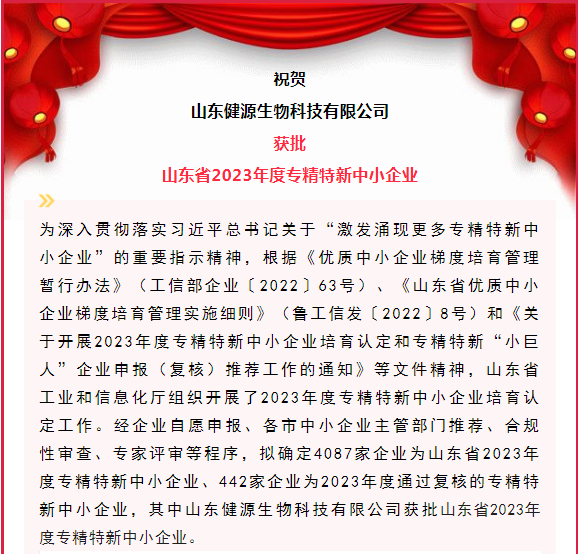 山東健源生物獲批山東省2023年度專精特新中小企業