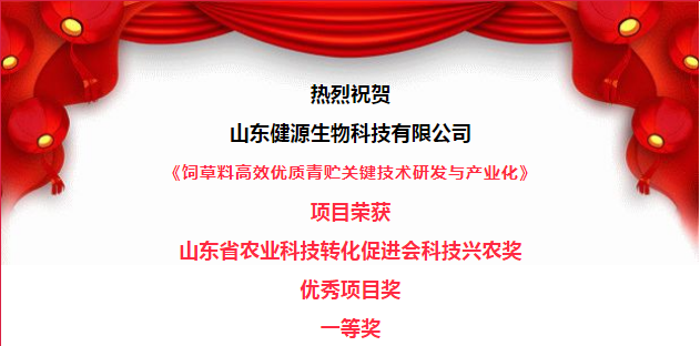 2023年5月27日, 第三屆全省科技興農獎表彰獎勵大會在青島成功舉行,會上對在2022年度全省農業科技成果轉化工作中涌現的先進集體、先進個人和優秀項目進行表彰,山東健源生物科技有限公司《飼草料高效優質青貯關鍵技術研發與產業化》項目榮獲山東省農業科技轉化促進會科技興農獎優秀項目獎一等獎。