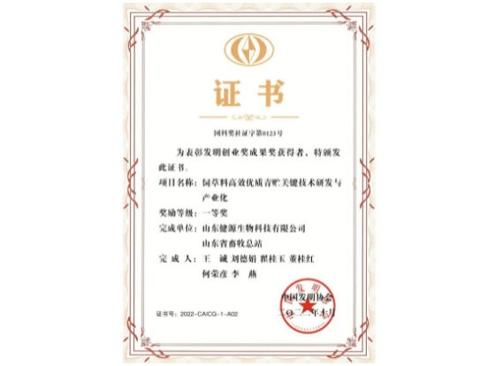 近日,在中國(guó)發(fā)明協(xié)會(huì)舉辦的“2022年度第三屆發(fā)明創(chuàng)業(yè)獎(jiǎng)成果獎(jiǎng)”全國(guó)評(píng)比中,山東健源生物科技有限公司《飼草料高效優(yōu)質(zhì)青貯關(guān)鍵技術(shù)研發(fā)與產(chǎn)業(yè)化》項(xiàng)目榮獲中國(guó)發(fā)明協(xié)會(huì)發(fā)明創(chuàng)業(yè)獎(jiǎng)成果獎(jiǎng)一等獎(jiǎng),標(biāo)志著山東健源生物在發(fā)明創(chuàng)業(yè)獎(jiǎng)成果獎(jiǎng)上取得突破。