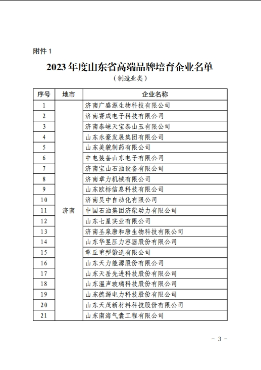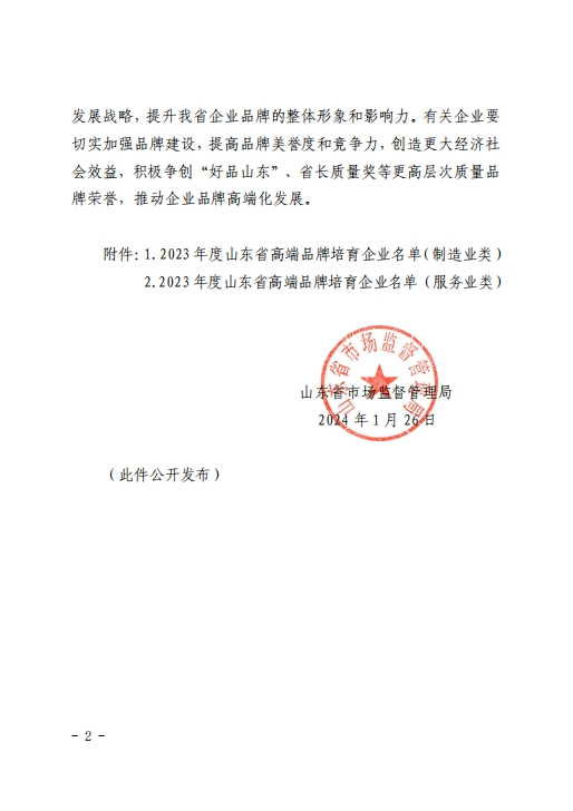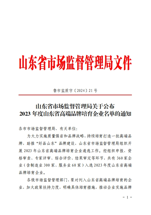 發布時間:[2024-2-4 8:44:32] 瀏覽量:3719次山東省市場監督管理局主持開展的山東省高端品牌培育企業評選工作是培育質量高、效益高、誠信度高、美譽度高的山東企業品牌,是深入實施質量強省及品牌戰略,共建共享“好品山東”,加快推進山東省品牌高端化進程的一項重要工作。經組織申報、資格審查、專家評審、綜合評價、結果審定等環節,共有360家企業(含制造業300家、服務業60家)入選2023年度山東省高端品牌培育企業。