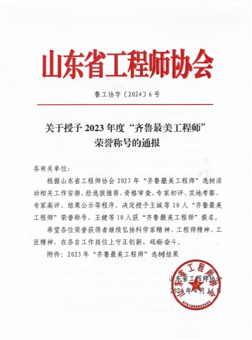 為全面貫徹落實習近平總書記關于人才工作的重要講話精神,大力弘揚科學家精神、工匠精神,激發動員廣大工程技術人才守正創新、砥礪奮斗。按照中共山東省委人才工作領導小組辦公室《關于進一步加強卓越工程師隊伍建設的若干措施的通知》要求,山東省工程師協會在全省開展了2023年度“齊魯最美工程師”選樹工作。經選拔推薦、資格審查、專家初評、實地考察、專家高評、結果公示等程序,決定授予王誠等10人“齊魯最美工程師”榮譽稱號。