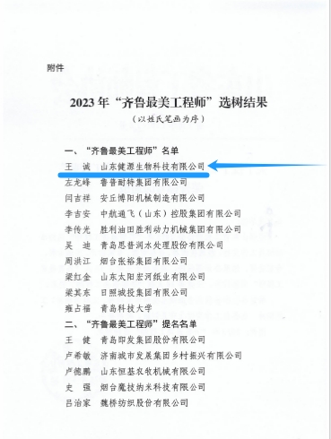 發布時間:[2024-7-5 15:51:56] 瀏覽量:3448次近日,山東省工程師協會下發關于授予2023年度“齊魯最美工程師”榮譽稱號的通報,山東健源生物科技有限公司董事長王誠被授予2023年度“齊魯最美工程師”榮譽稱號。