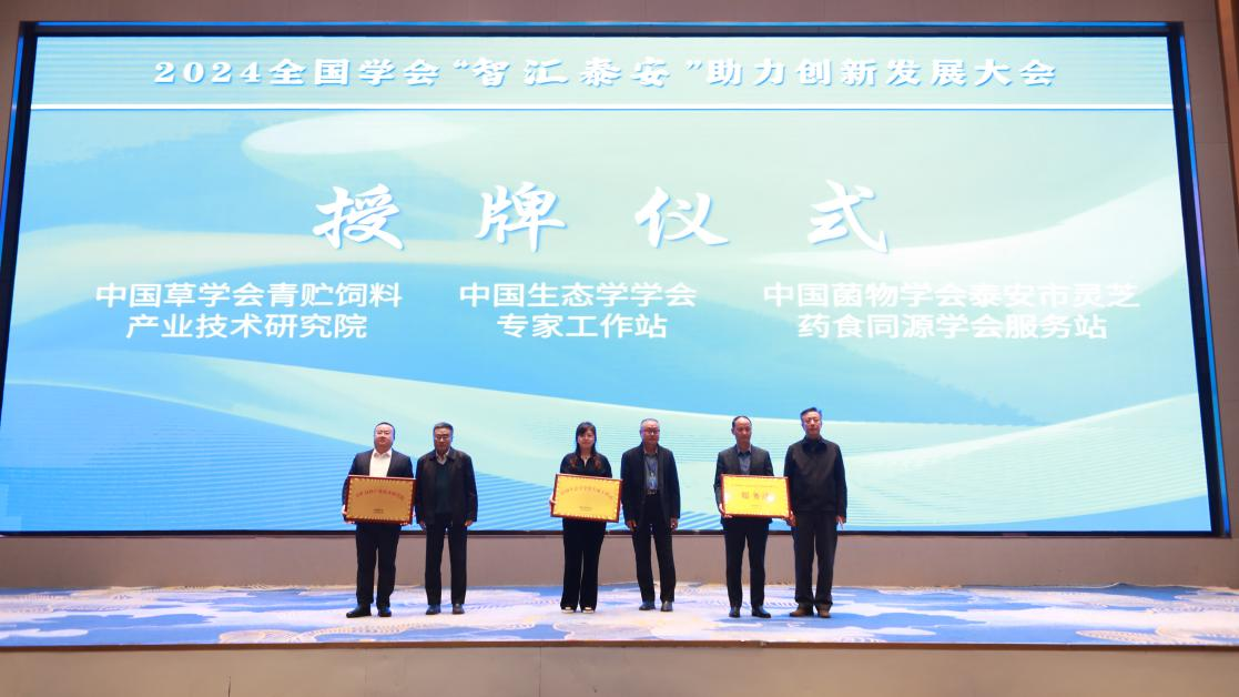 會前,中國檢驗檢測學會等11家全國學會分別深入40余家企業實地指導調研,征集企業技術需求,確定了技術服務等一系列合作事項。與會專家領導共同為青貯飼料產業技術研究院、中國生態學學會專家工作站、中國菌物學會泰安市靈芝藥食同源學會服務站、山東汽車工程學會助力企業創新驅動發展服務站等19個平臺授牌。中國草學會青貯飼料產業技術研究院落戶山東健源生物科技有限公司,中國農業大學草業科技學院、中國草學會副理事長王堃教授為健源生物授牌,健源生物董事長王誠上臺接受牌匾。
