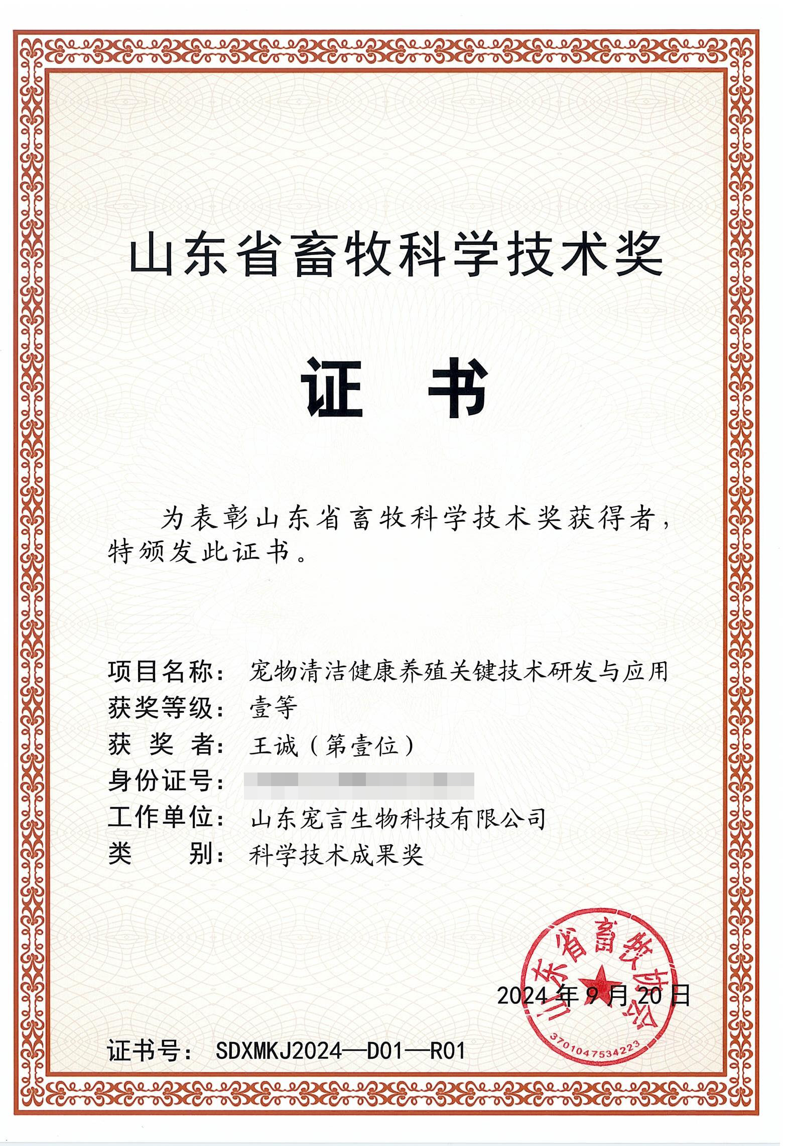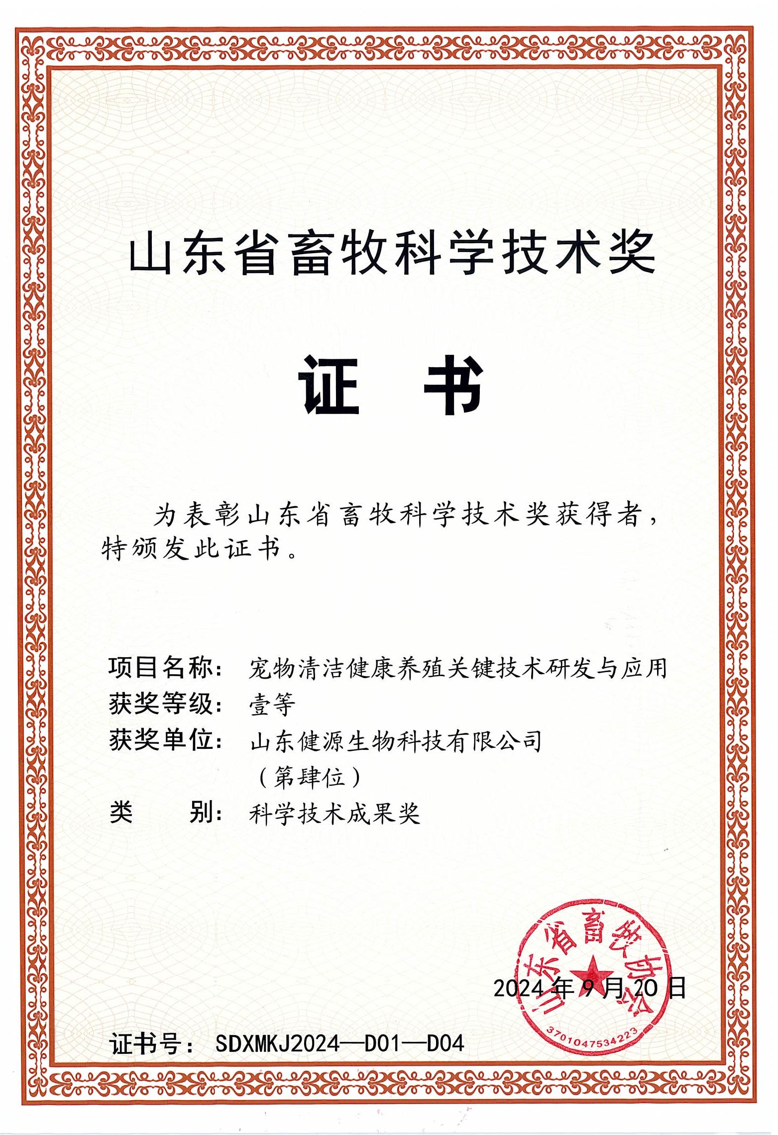 山東健源生物科技有限公司與子公司山東寵言生物科技有限公司共同完成的“寵物清潔健康養殖關鍵技術研發與應用”項目,憑借其創新性與實用性,榮獲山東省畜牧科學技術獎科學技術成果獎一等獎。
