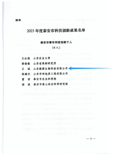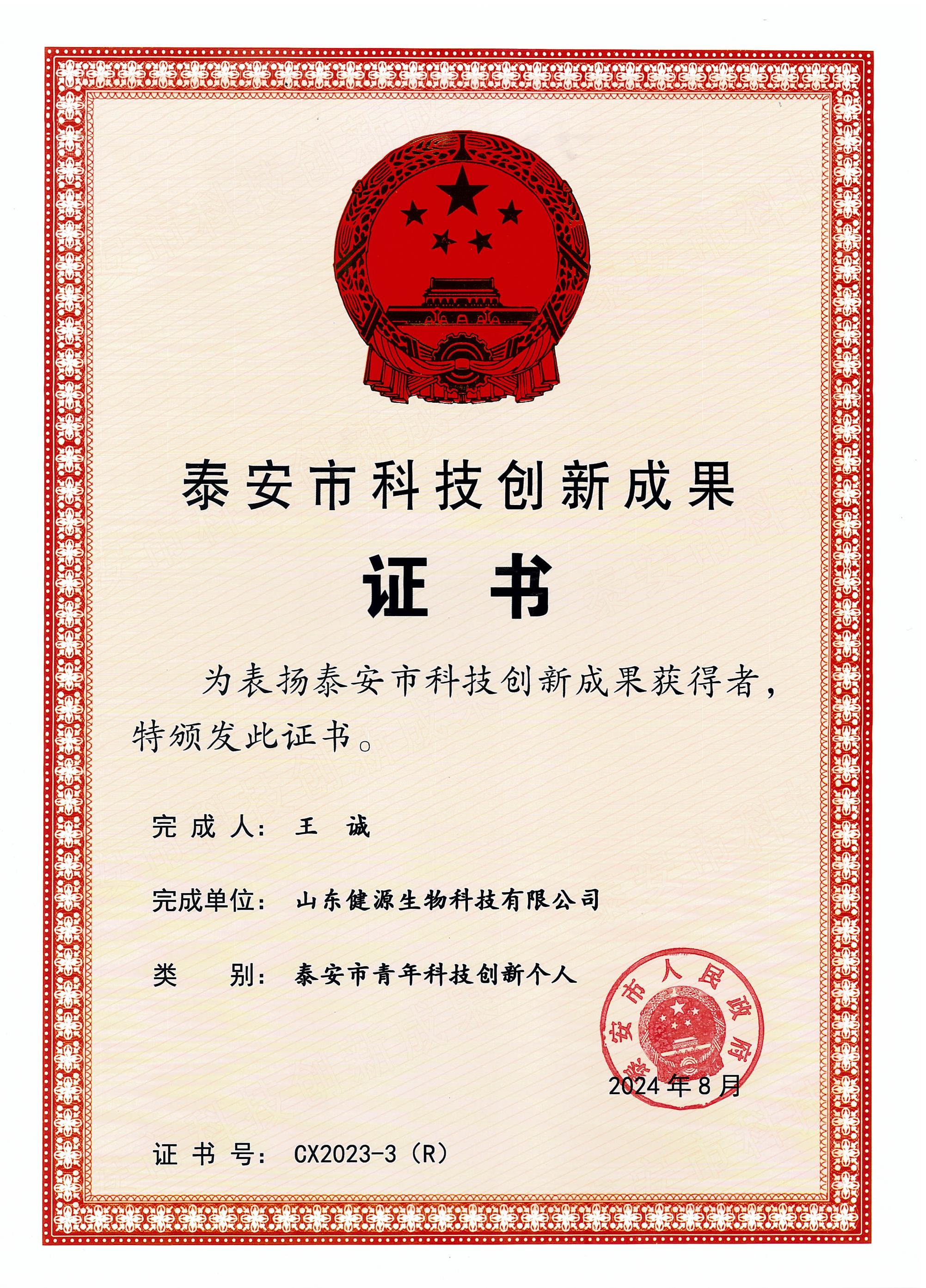 會上宣讀了《泰安市獲2023年度國家、省科學技術獎項目名單》和《泰安市人民政府關于公布2023年度泰安市科技創(chuàng)新成果名單的通知》,為2023年度省科學技術獎獲獎代表及市科技創(chuàng)新成果完成人代表頒發(fā)證書。山東健源生物科技有限公司董事長王誠榮獲泰安市青年科技創(chuàng)新個人。