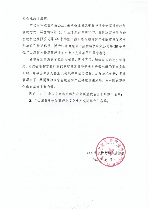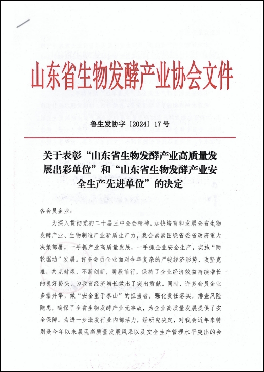 發布時間:[2024-12-19 11:31:42] 瀏覽量:2537次近日,山東省生物發酵產業協會發布關于表彰“山東省生物發酵產業高質量發展出彩單位”和“山東省生物發酵產業安全生產先進單位”的決定,山東健源生物科技有限公司榮獲“山東省生物發酵產業高質量發展出彩單位”稱號。