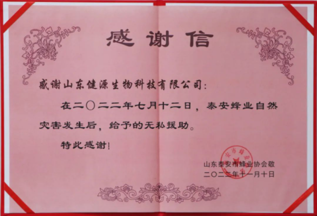2023-4-12 健源生物收到山東泰安市蜂業協會感謝信和錦旗