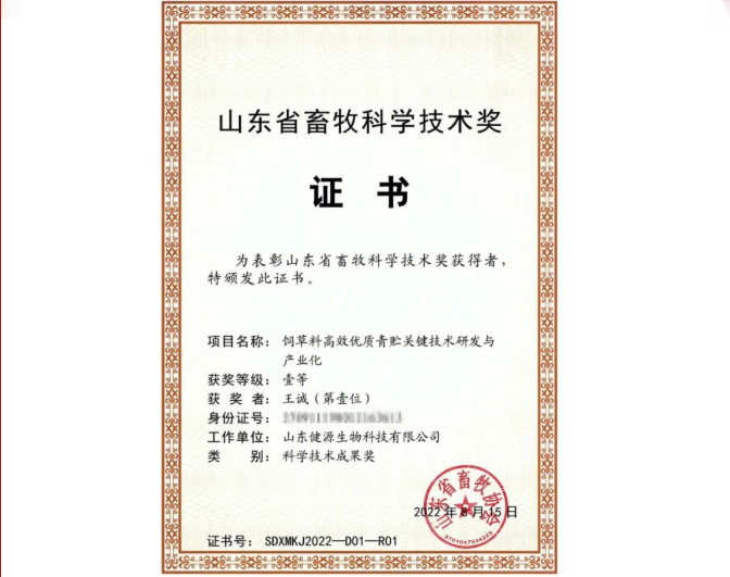 2022-8-17 【喜報(bào)】山東健源生物榮獲山東省畜牧科學(xué)技術(shù)獎一等獎