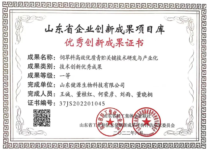 2022-7-15 山東健源生物榮獲山東省企業創新成果項目庫 “技術創新優秀成果一等獎”