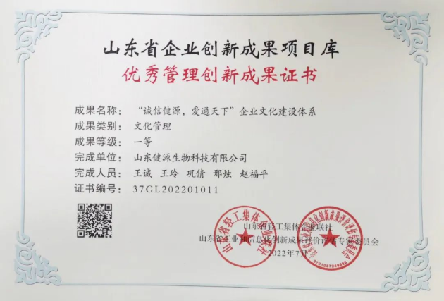 2022-7-22 山東健源生物榮獲山東省企業創新成果項目庫優秀管理創新成果一等獎