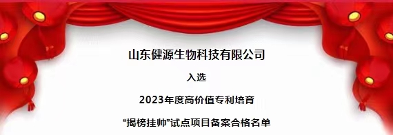 山東健源生物科技有限公司 入選 2023年度高價值專利培育 “揭榜掛帥”試點項目備案合格名單 日前...