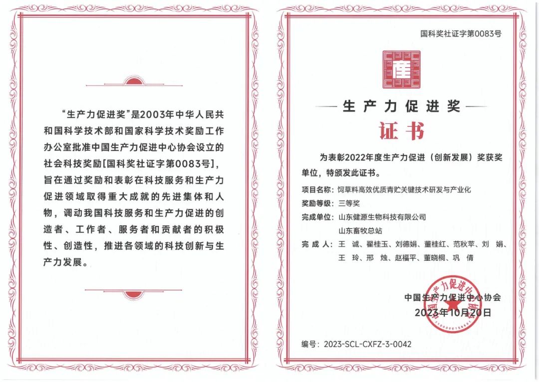 山東健源生物科技有限公司青貯專用乳酸菌制劑、瘤胃調控專用高活性生物制劑,兩款產品同時被評為山東省生物...