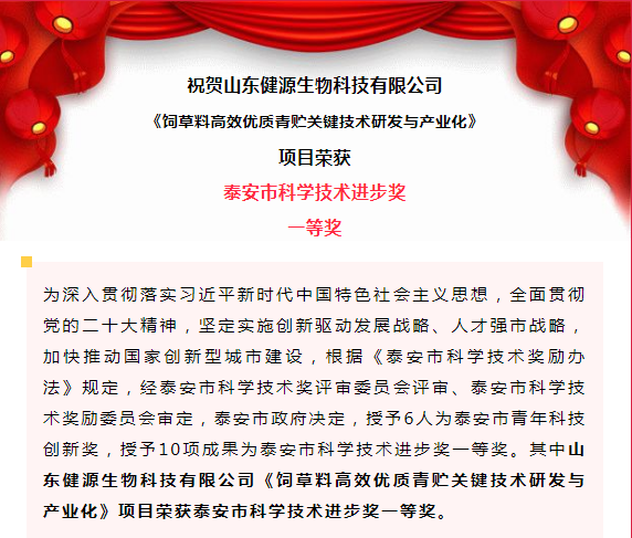 2023-4-24 山東健源生物榮獲泰安市科學(xué)技術(shù)進步獎一等獎