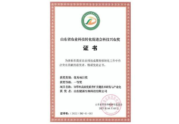 2023-6-1 山東健源生物榮獲山東省農(nóng)業(yè)科技轉(zhuǎn)化促進會科技興農(nóng)獎一等獎