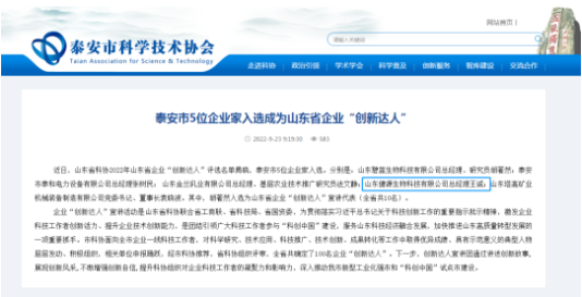 山東健源生物董事長王誠榮獲2022山東省企業“創新達人”稱號
