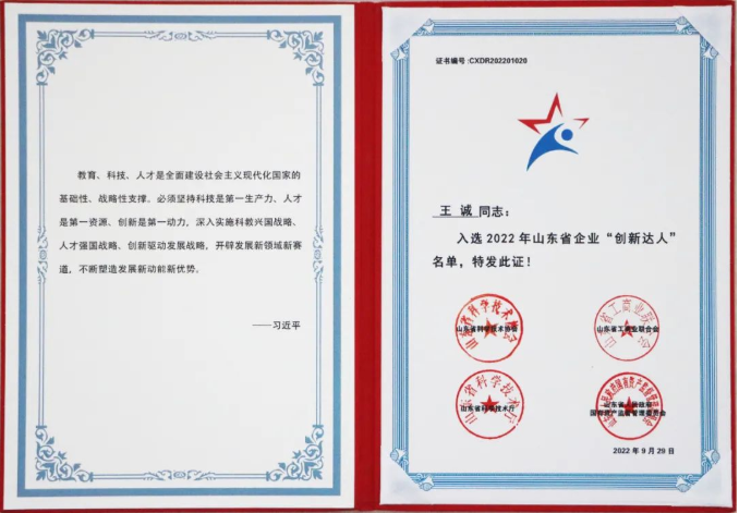 祝賀山東健源生物董事長王誠榮獲2022年山東省企業“創新達人”稱號