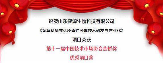 經各省市、部門、各地技術市場協會(促進會)和有關單位的認真推薦,第十一屆金橋獎評審委員會評審,第十一屆金橋獎組織委員會審定,199 個項目獲優秀項目獎,其中山東健源生物科技有限公司《飼草料高效優質青貯關鍵技術研發與產業化》項目榮獲第十一屆中國技術市場協會金橋獎優秀項目獎。