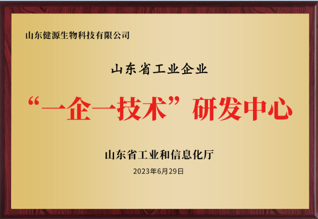 山東省工業和信息化廳組織開展了2023年山東省“一企一技術”研發中心認定工作,經企業自愿申報、有關部門推薦、專家論證等程序,山東健源生物科技有限公司被認定為2023年山東省“一企一技術”研發中心。