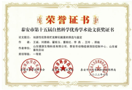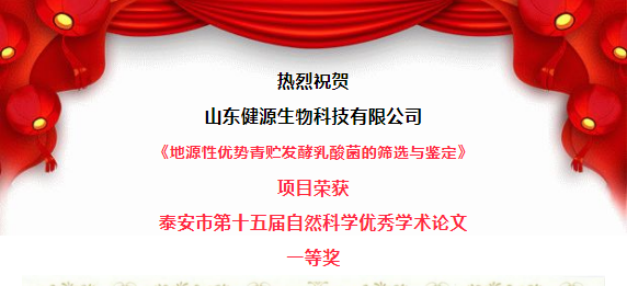 為深入推進泰安市“科創中國”試點市建設,培養人才,繁榮學術,鼓勵創新,提升泰安市廣大科技工作者的學術水平,根據泰安市人才工作計劃,由泰安市科協、泰安市科技局、泰安市人社局在全市組織開展了泰安市第十五屆自然科學優秀學術論文評選活動。本次評選堅持公開、公平、公正的原則,采用異地評委評選的方式進行,共評出一等獎42項;二等獎70項;三等獎82項。山東健源生物科技有限公司《地源性優勢青貯發酵乳酸菌的篩選與鑒定》項目榮獲泰安市第十五屆自然科學優秀學術論文一等獎。