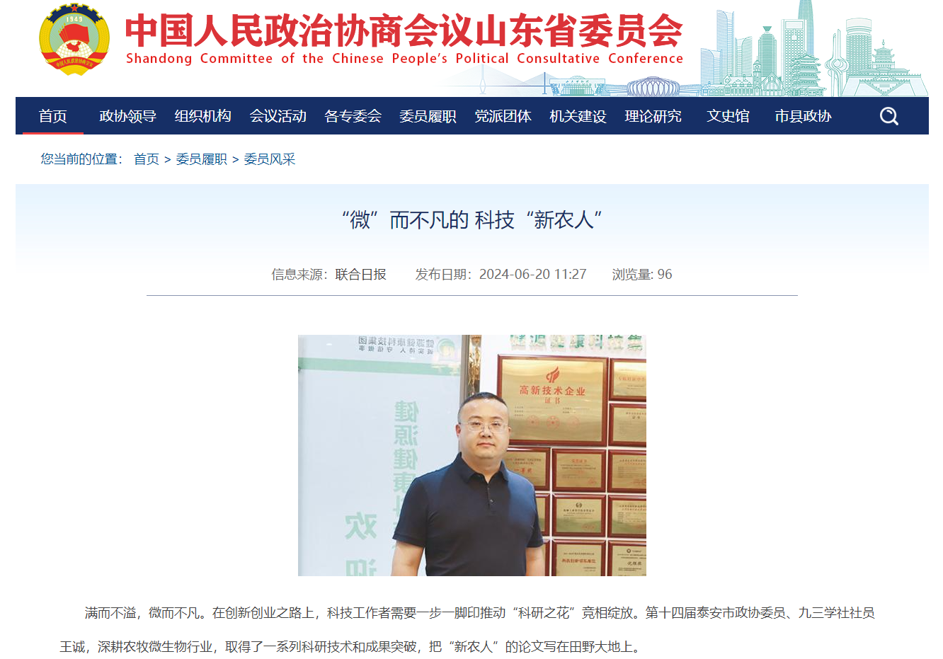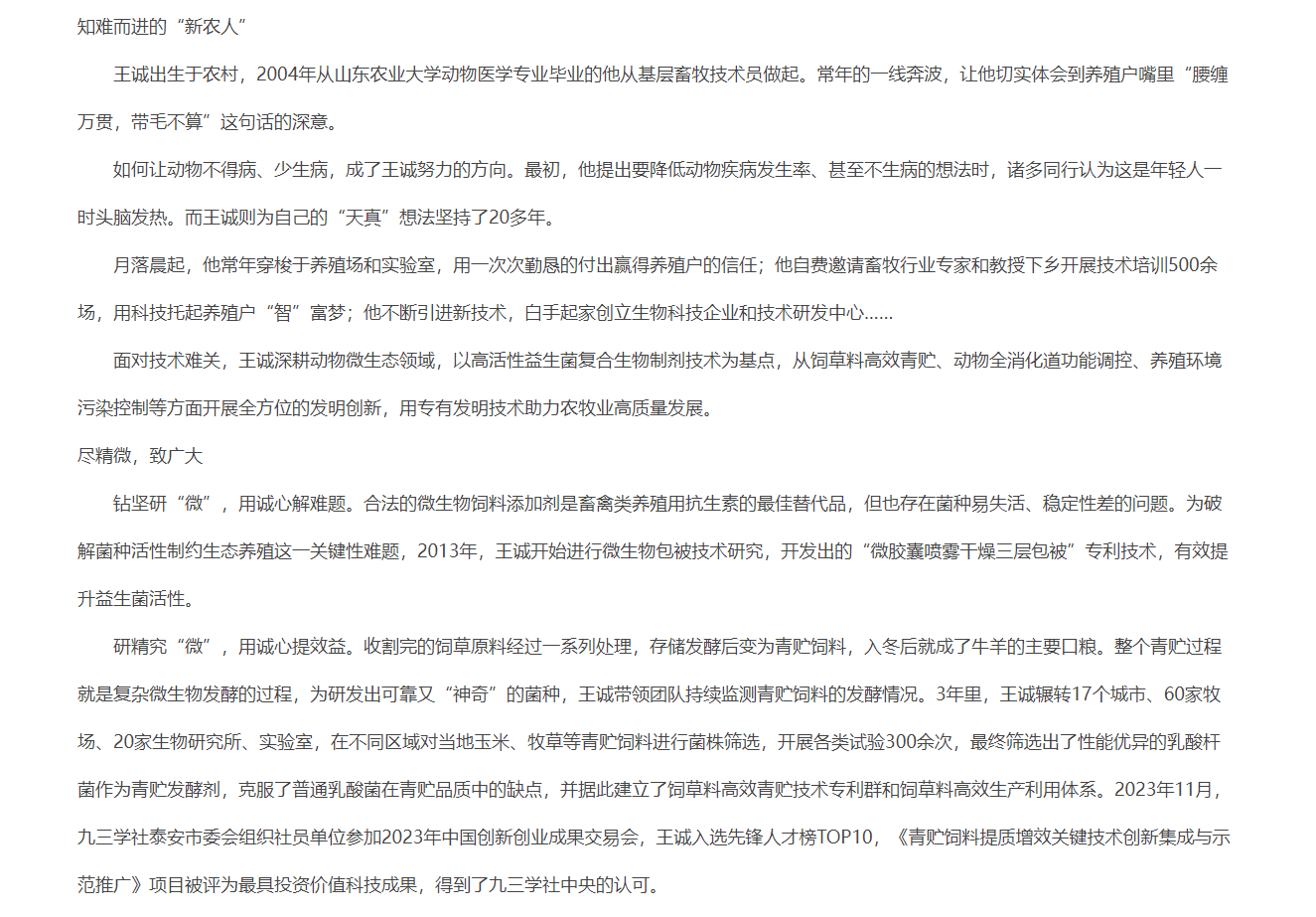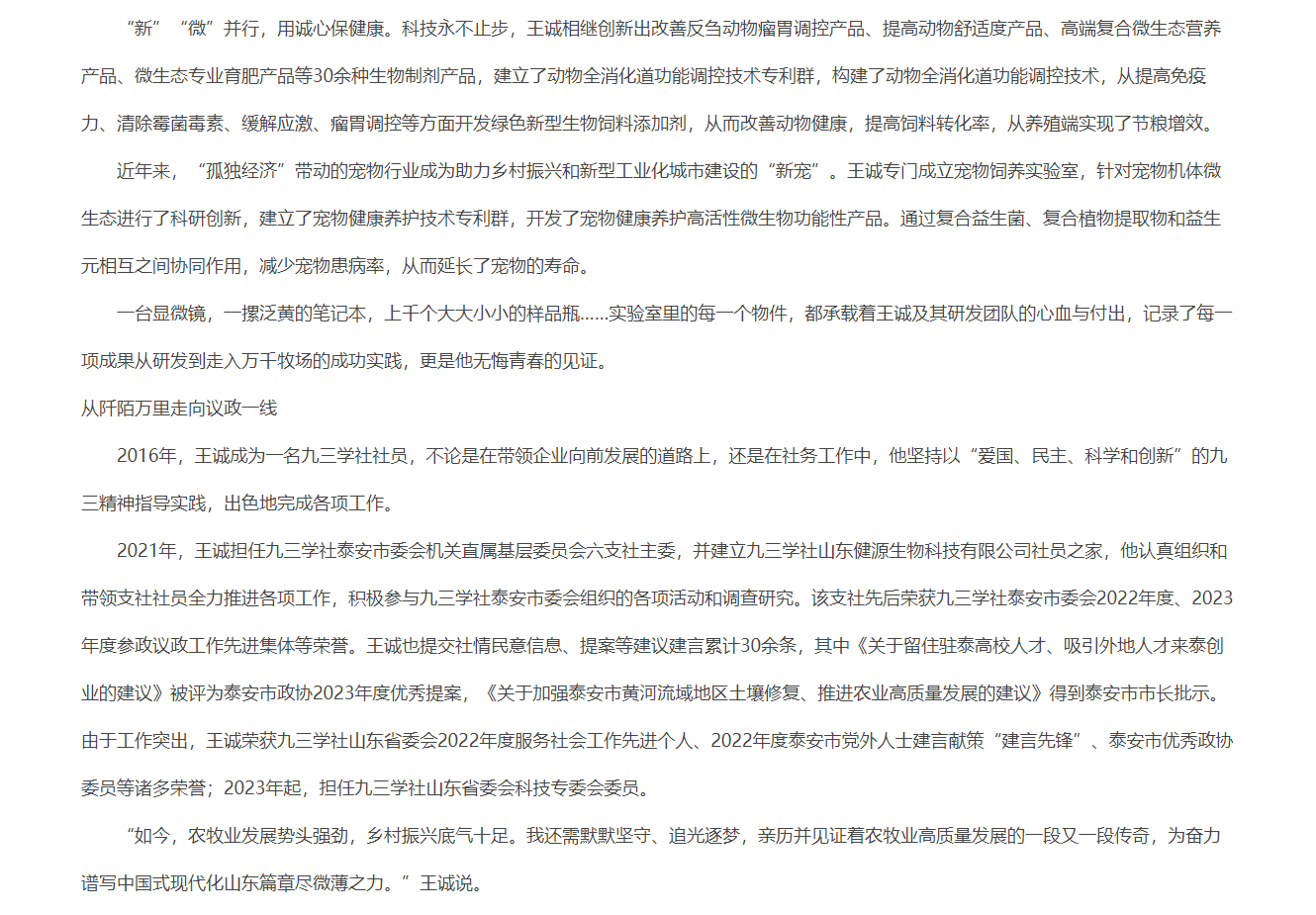 發布時間:[2024-8-7 15:16:1] 瀏覽量:3728次近日,中國人民政治協商會議山東省委員會官網推送《“微”而不凡的 科技“新農人”》文章,報道山東健源生物科技有限公司董事長王誠作為“新農人”,20多年來深耕微生態領域,以高活動性益生菌復合生物制劑技術為基點,從飼草料高效青貯、動物全消化道功能調控、養殖環境污染控制等方面全方位的發明創新,用專有發明技術助力農牧業高質量發展。而作為一名九三學社社員,王誠董事長堅持以“愛國、民主、科學和創新”的九三精神指導實踐,出色地完成各項工作。全文如下: